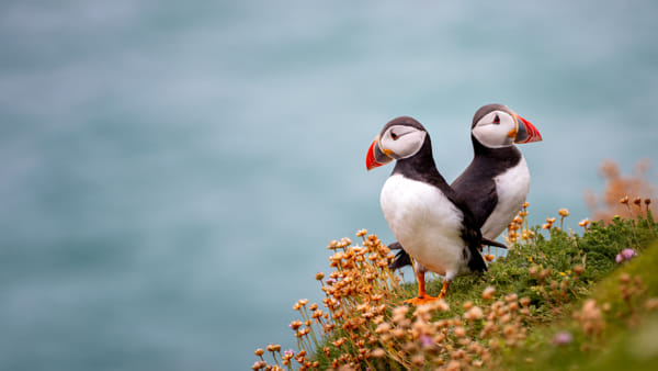 Close-up of a puffin, Atlantic Puffin, Puffin, Fratercula artica, artic black and white cute bird with red bill sitting on the rock, Sea bird from Iceland. Cute bird on the rock cliff