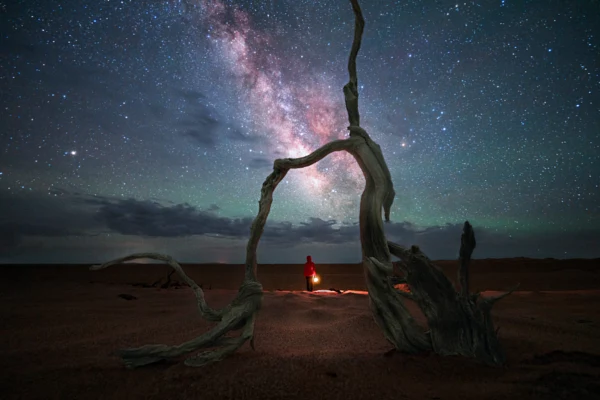 星河之下,沙地上的梭梭枯树如同“风”字框架,加上天边的云,构成一幅星河风云图。实景拍摄于海西州地下雅丹景区雅丹部落。