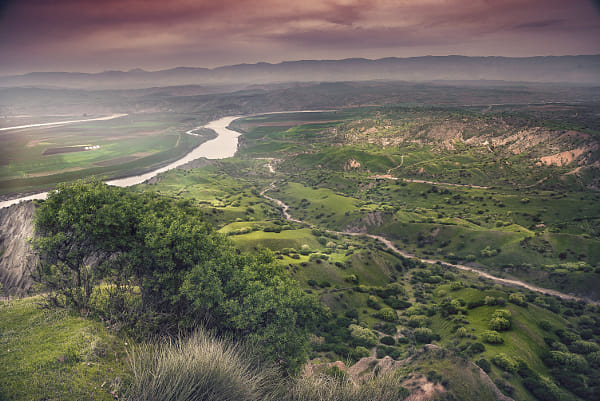 In the Top Mount near sunset rise a wonderful view with a spring a see green land to away