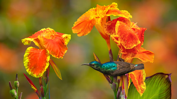 Metallic viridiscent hues of the Purple Sunbird on this Canna Indica flower creates an explosion of colours at the meadow in spring. A vibrant art frame painted from the colour palette of nature.