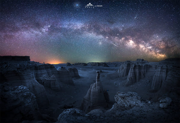 拍摄这里时并没有感觉这个场景的特别之处,但在修图时,突然发现这个场景特别像一个曾经辉煌,而今没落在地球的外星文明的王朝神殿,中间是高耸的国王宝座,周两旁矗立的则是威武的侍卫与大臣,最终他们都化身为沉寂的雅丹,隐匿于在大海道的深处,头顶的王冠与盔甲的光泽,在岁月与尘埃中暗淡消失。当银河升起,他们被星辰的光芒唤醒,缓缓举首,望向天际深处的家园……….