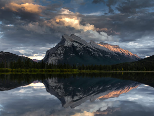 Mount Rundle – Wedge-shaped mountain, sitting at 9,672 feet with an advanced hiking trail. It is a distinctive landmark of this region. The photo was taken from Vermilion Lakes. Fall is a beautiful time to visit as the sun lights up the shrubs and grasses dressed in their fall colors. Spending a few hours relaxing along the shores of the lake, enjoying the spectacular views of Mount Rundle at sunset….
