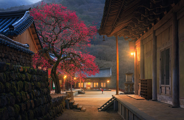 Early morning at Hwaeomsa enjoying the beautiful sight of the famous red plum blossom tree.