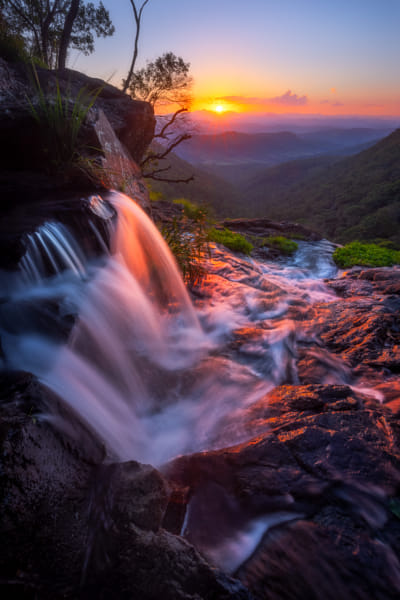 The beautiful top of Moran’s falls before it plunges into the valley below at sunset. One of the many wonders of Lamington National Park .