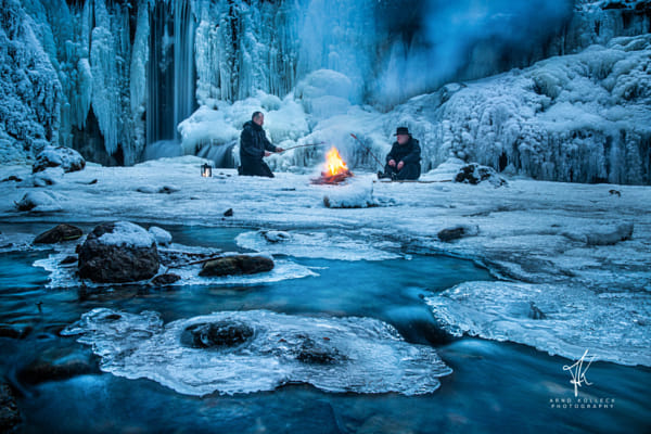 After a period with extremely cold nights this waterfall finally froze. It was the first time in years. While I was taking pictures the ice started to break and the very next day most of the ice was gone. So these two picked the perfect day for their arctic bonfire.