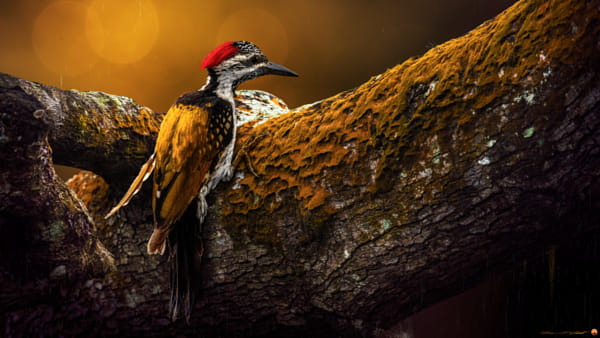 A Flameback woodpecker searching for mites and worms among the bark of a cashew tree. The black-rumped flameback, also known as the lesser golden-backed woodpecker or lesser goldenback, is a woodpecker found widely distributed in the Indian subcontinent. Scientific name:Â Dinopium benghalense