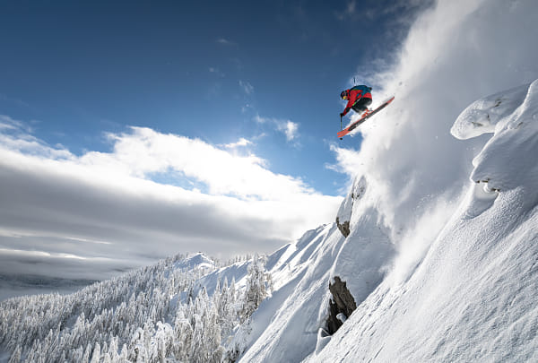 A skier makes a jump-drop from a high cliff against a blue sky leaving a trail of snow powder in the mountains.