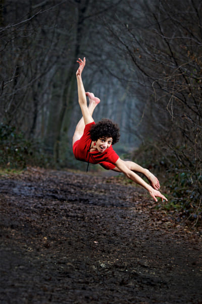 Levitation session in neverland forest. Race girl flying throw trees and the deep forest.