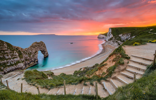 A stunning sunset over the famour Durdle Door sea arch.