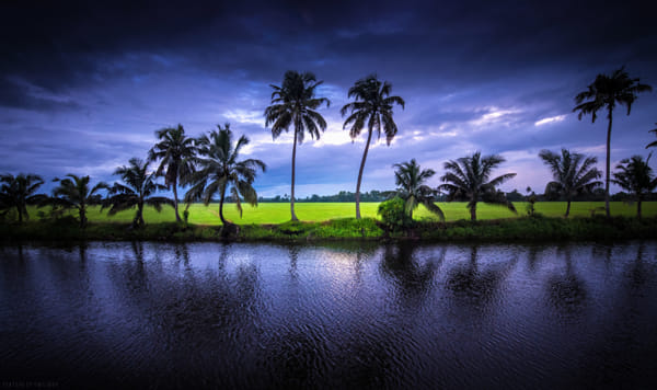 Texture Of Twilight! The lustrous glow of twilight frozen in ripples, the reflection of coconut palms and the viridescent green fields of paddy shrouded in monsoon clouds are all glimpses to what the God’s own country looks like. Texture of a surreal twilight from Kerala.