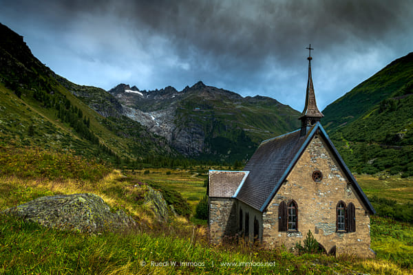 The mountain chapel of Gletsch before an alpine thunderstorm. by Ruedi W. Immoos