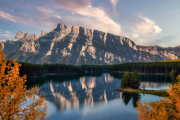 A reflection of Rundle Mountain in Two Jack Lake located in Banff National Park in the Canadian Rockies.