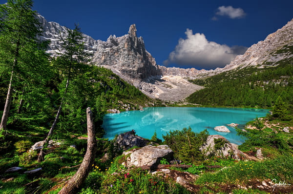 This photo of lake Sorapis in the italian dolomits was taken this year at the end of june. As you can see the weather was really nice … The turquoise color of this charming lake is incredibly intensive … More photos of the dolomits: you are heartily invited for a visit of www.gubido.de :-)))
