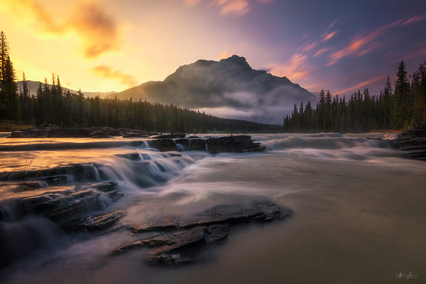 I was the first one and the only one on site watching the amazing sunrise at Athabasca Fall, Jasper National Park, AB, Canada.