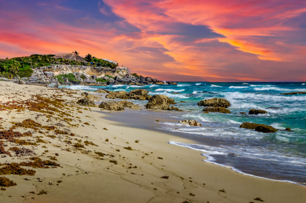 Sunset at Cozumel Mexico as the waves crash on the shore. Cozumel Mexico