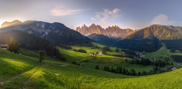 The mountain and meadow basks in refreshing morning light at Santa Maddalena