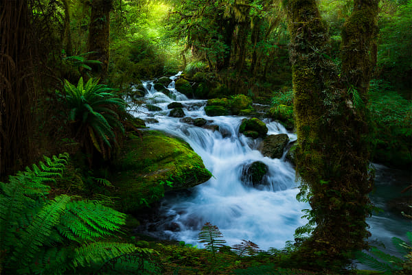 Coursing down and through the foothills of the mountains, a myriad of creeks, cascades and streams intertwine and flow through lush forest. Vibrant shades of green adorn the ferns and beech trees, from the ground up.