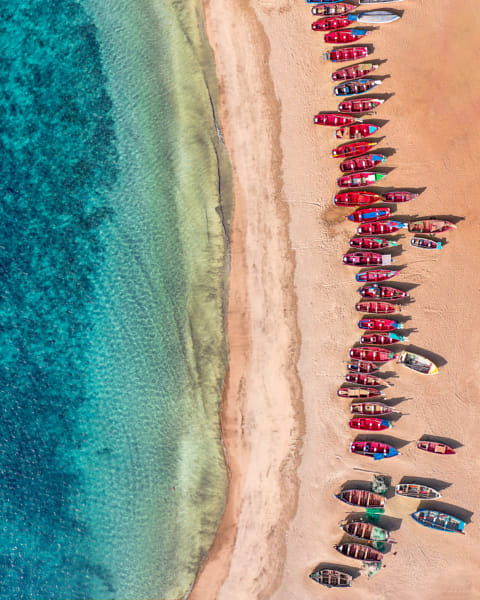 Postcard from Cape Verde: beach of Tarrafal with fishing boats very well aligned and composed.