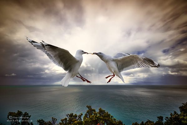A mid-air contest for a scrap of food at the Mount Defiance lookout on the Great Ocean Road in Victoria.