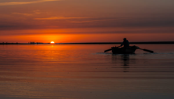 a person in a fishing boat in the river at sunset pulls the fishing net
