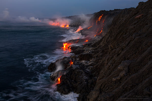 Multiple rivers of lava pour into the cool Pacific, extending the coastline of the island of Hawai‘i.