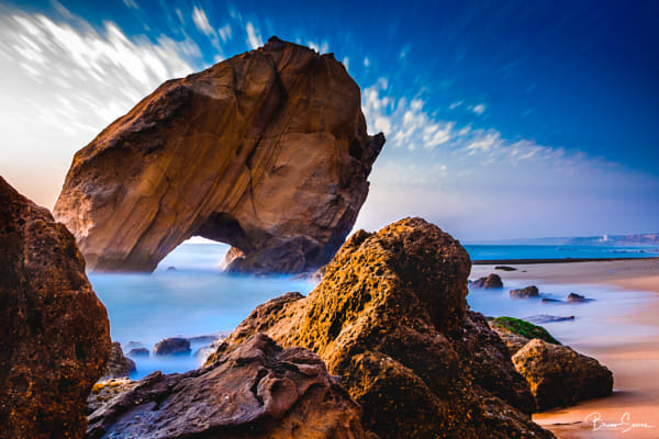 On a beautiful summer evening, the sun set in perfect position through the rock arch at Bridgewater Bay.
