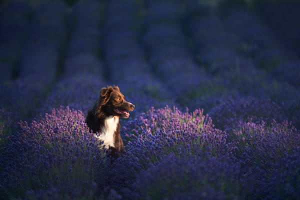 Australian shepherd Gambit posing in first rays of sun on lavender field