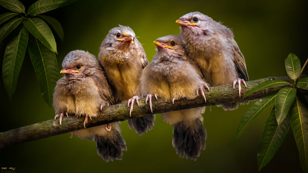 Four hungry Jungle Babbler chicks wait in huddle for their mom, who is out hunting. And the band will play promptly on her arrival. The avian Spice Girls !