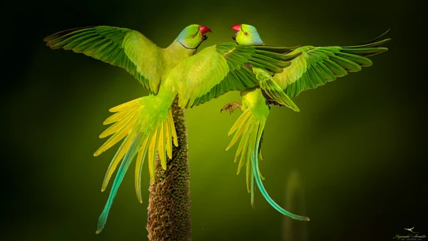 It is the pearl millet season and the rose ringed parakeets go into a feeding frenzy. More often than not, they enter a scuffle competing for that perfect perching spot on top of the ripest millet. A moment of suspended animation frozen to depict the green world of the parrots !