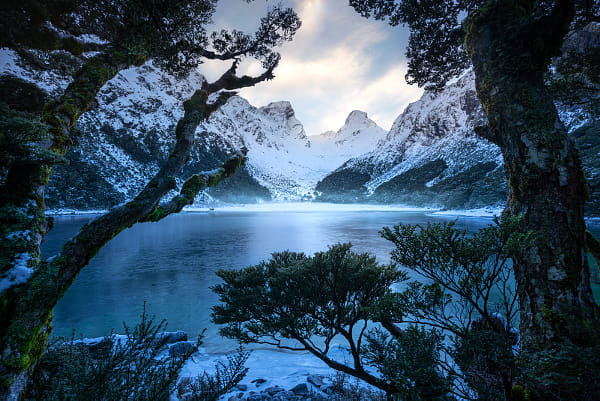 The simplified purity that winter brings to the landscape, as lakes freeze over and the surrounding landscape is turned to white. There’s a certain smell in the air within the beech forests of Fiordland, particularly in winter when branches are frost covered in the crips air. On this morning, temperatures were -10 celsius and hoar frost decorated the shadow filled valleys. The warm, morning coffee was much appreciated after this sunrise shoot.