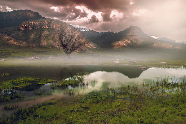 The shot is a single exposure for mountains, lake and tree combined with another tilted upward to encompass the sky areas, so that I was able to control the perspective in a way I thought best suited the scene.