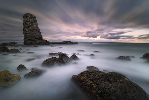 In this photography I’ve tried to make a very long exposure that creates a marked misty effect of the water and gives the whole scene a mystical appearance. In the frame I wanted to enhance the depth of the image by capturing the movement of the clouds perpendicular to the horizon. To achieve the mistiness of the water at its maximum splendor it was necessary to have a day with big waves, which made it very difficult to take the image since the waves splash the camera directly and made it necessary to cover it at each hit to avoid splatters in the lens and filters. The image was taken at Fontaniecha Beach (Asturias, north of Spain) and I used a Haida 10 stops ND filter and a Nisi 4 stops soft graduated ND filter to make it.