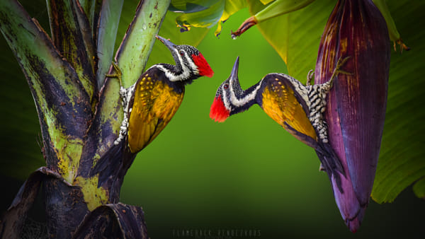 A Flameback Rendezvous ! The black-rumped flameback (Dinopium benghalense), also known as the lesser golden-backed or lesser goldenback woodpecker. This couple is on a mission to explore my banana plantation. The Colour contrasting and popping of hues seen here is a digital realisation achieved in my attempt to master the hidden potentials of advanced Adobe software. Give me thumps up if I am anywhere close to triggering your senses.