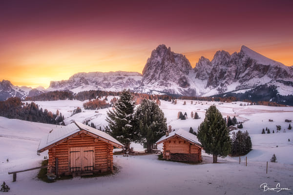 You keep going to arrive in time to see the sun warming that white velvet cloak. And you have to do it in an epic location, on the largest plateau in Europe that rises almost 2000m in altitude! In the Alpe di Siusi! If you already felt big for being so high, your heart would be filled by the sight of the horizon with authentic pink stone cliffs, that had once been under the sea, rising from the ground, and your soul would be warmed by the cosy wooden houses all over the plateau that snuggled you from the cold your body felt.