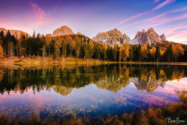 The Lago d’Antorno is perfectly positioned to enable you to contemplate in the distance, the mountain ranges that make our eyes marvelous! When I got to the lake, I was facing North. It was in a quick moment that I began to see the sunset rose colours appearing at my right in the sky. I looked, and I could no longer take my eyes off that view. The pink tones were also reflecting in the still waters of the lake. But it was not just thats, it was also the yellow trees of autumn, and above it all, the mountains, imposing and authoritative, above the trees, which prevented me from taking my eyes out. I did not take them out, I turned around and the camera registered everything I saw and felt! To see the Cadini di Misurina (a mountainous group of Dolomites with peaks reaching the 2,839m altitude that climbers try to conquer) showing of their beauty on the lake, accompanied by this autumn environment was delicious! I hope you can feel what I felt!
