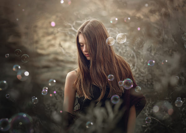Dreamy portrait of a girl surrounded by bubbles. Edited with JD QuickFlow actions and tints and soap bubble overlays I’m making.