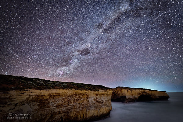Deep night view adjacent to the iconic London Bridge limestone stack on the Great Ocean Road in Victoria.