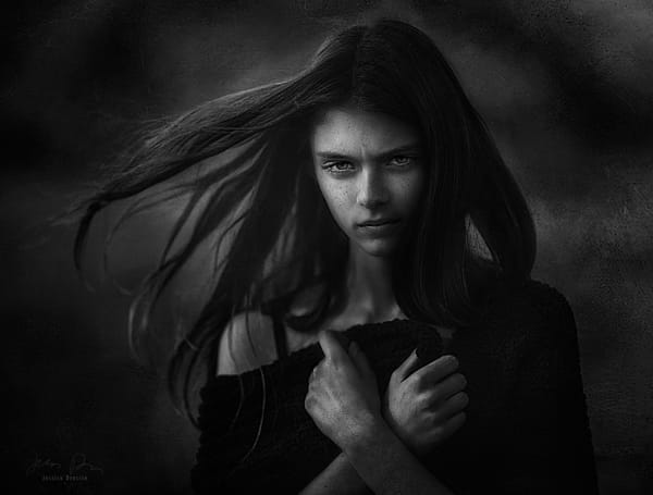 Black and white portrait of a girl with freckles scowling, her hair blowing in the wind. www.JessicaDrossin.com