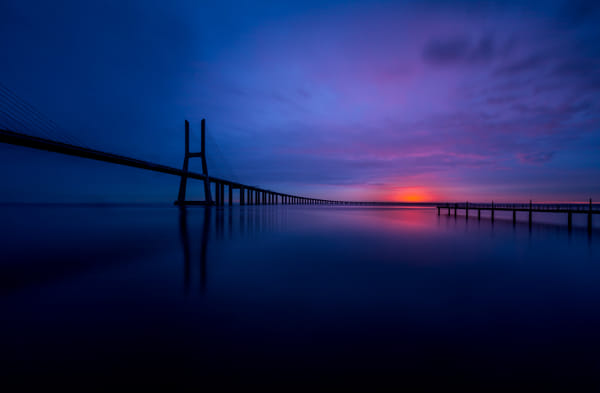 The first light after blue hour at Vasco da Gama bridge. Cloesd sky but calm morning with amazing reflections.