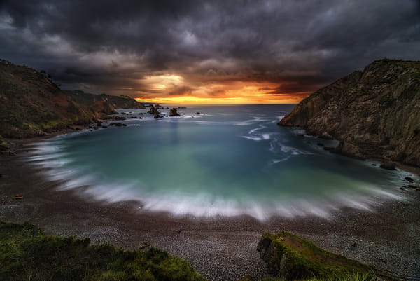 Sometimes luck smiles at us and a spectacular sunset coincides in a wonderful place, this was the case of this photo. I often visit the Playa del Silencio because, in addition to being an incredible place, it is one of the few beaches in Asturias (north of Spain) that look west and allow you to capture the sunset in all its splendor, this day was one of the most impressive sunsets that I remember, with the sky staining deep red that made it look like hell itself but surrounded by a paradisiacal environment. Mix of two shots with a Laowa 12mm Zero-D, one normal exposure for the sky and a long exposure for the rest of the image taken with a Nisi 4 stops soft graduated ND filter and Haida 10 stops ND filter. Hay veces que la suerte nos sonríe y coincide una puesta de sol espectacular en un lugar maravilloso, este fue el caso de esta foto. Suelo visitar con frecuencia la Playa del Silencio porque, además de ser un lugar increíble, es de las pocas playas de Asturias que miran al oeste y permiten captar la puesta de sol en todo su esplendor, este día fue uno de los atardeceres más impresionantes que recuerdo, con el cielo tiñéndose de un rojo intenso que hacía que pareciese el mismísimo infierno pero rodeado de un entorno paradisiaco. Mezcla de dos tomas realizadas con un Laowa 12mm Zero-D, una exposición normal para el cielo y una larga exposición para el resto de la imagen utilizando, un filtro ND Nisi degradado suave de 4 pasos, y un filtro ND Haida de 10 pasos.