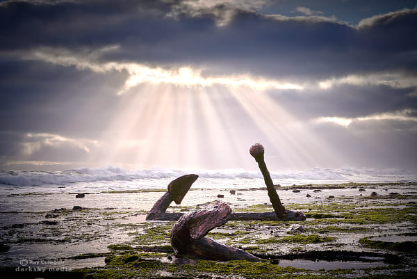 Late afternoon sunburst over the strewn remnants of forgotten vessels on Wreck Beach in Victoria.
