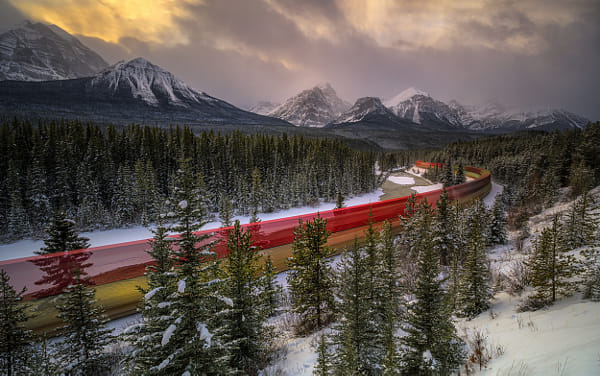With a fresh dump of snow, we headed to the lookout patiently waiting for the train traveling from Lake Louise to Banff Banff, and I knew in the back of my mind I need to nail the exposure and pick the right moment when the double-stacked containers were predominately red. If the exposure was too short, the trees in the background disappeared and too long, and the train lost definition. The perfect exposure ended up being 2.5 seconds at f/10.