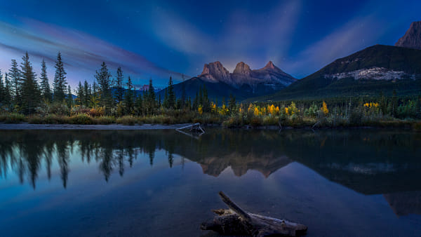 Three Sisters reflecting in Policeman’s Creek in Canmore, Alberta, Canada at first light.