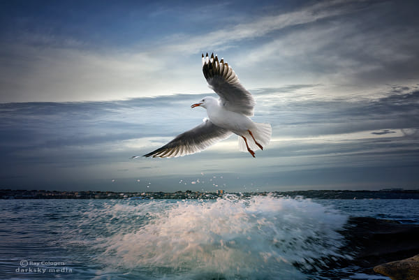 A southern silver gull navigates the sea spray over the rocks of Sydney Harbour north of The Domain.