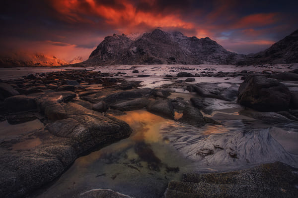 Rocky shore of Uttakleiv beach at sunset by Yiannis Pavlis