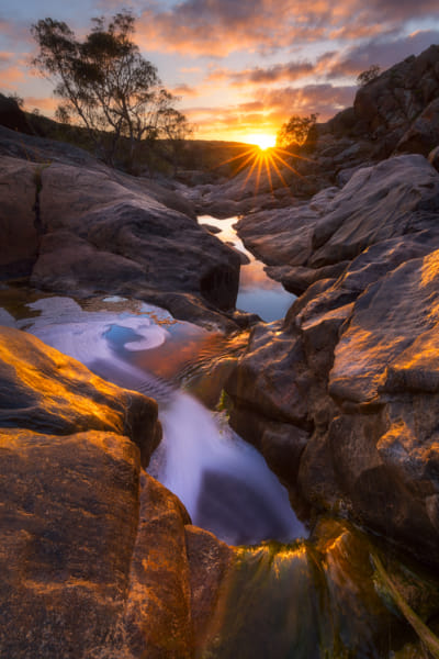 Beautiful morning light hits the granite rock at Mannum Falls (Reedy Creek) with very low water for this time of year due to sparse rainfall.