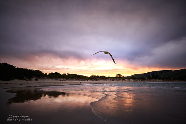 A lone gull rides the light breeze over the beach at Apollo Bay on the Great Ocean Road in Victoria.