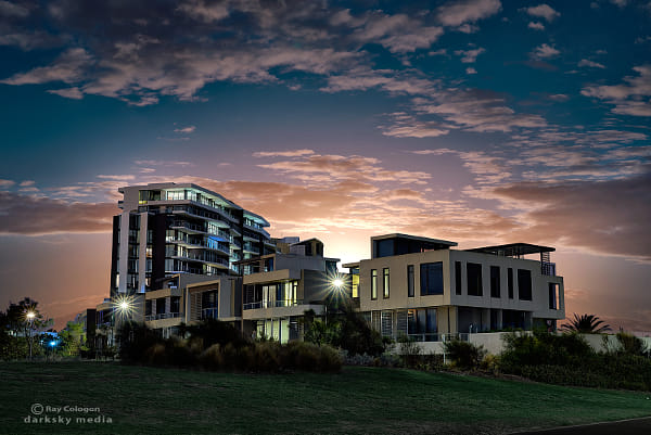 Waterfront buildings at Port Melbourne against the glow of the dawn sky.