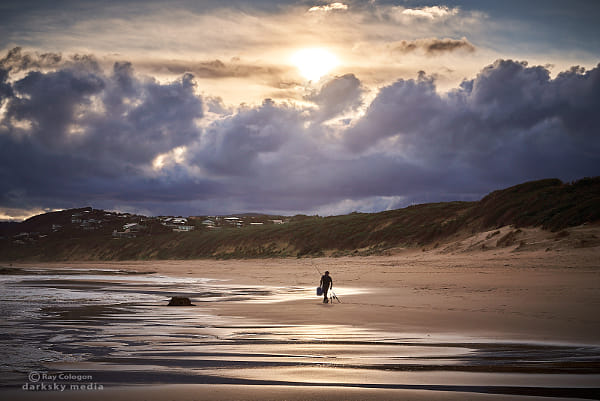 A lone fisherman treks the length of the beach under the setting Sun at Aireys Inlet on the Great Ocean Road in Victoria.