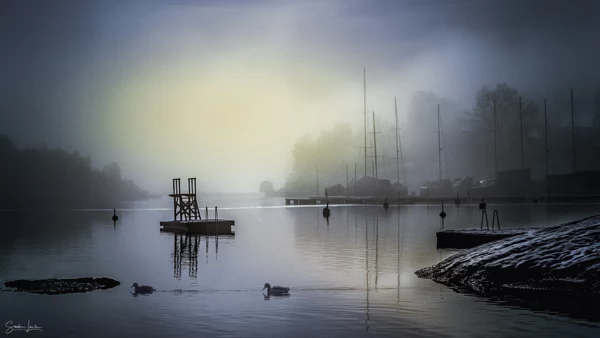 A view towards the Fjord of Oslo on a misty winter day. Both the bath jetty and the sailboats are waiting for the summer to come,, that is only a few weeks away, but the sun makes a vain attempt to help with the last snow melting.